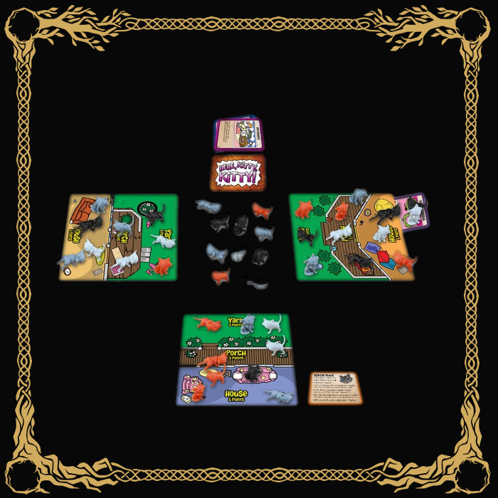 In the game, each player chooses a Property board, which contains three zones: the Yard, the Porch, and the House. At the end of the game, cats in the House are worth 5 points each, cats on the Porch are worth 3 points each, and cats in your Yard are worth 0 points. However, having cats in your Yard does have advantages for special scoring conditions, such as having the most cats of a single color or the most cats overall. All 40 cat miniatures are placed in the center of the table, and represent the Neighborhood. Each player is dealt 2 or 3 cards, depending on the number of players in the game.